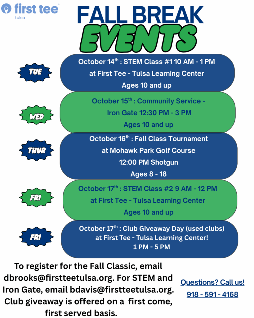 Mohawk Park Golf Course: 5223 E 41st St N, Tulsa, OK 74115 (class will meet at the practice putting green by the First Tee building)